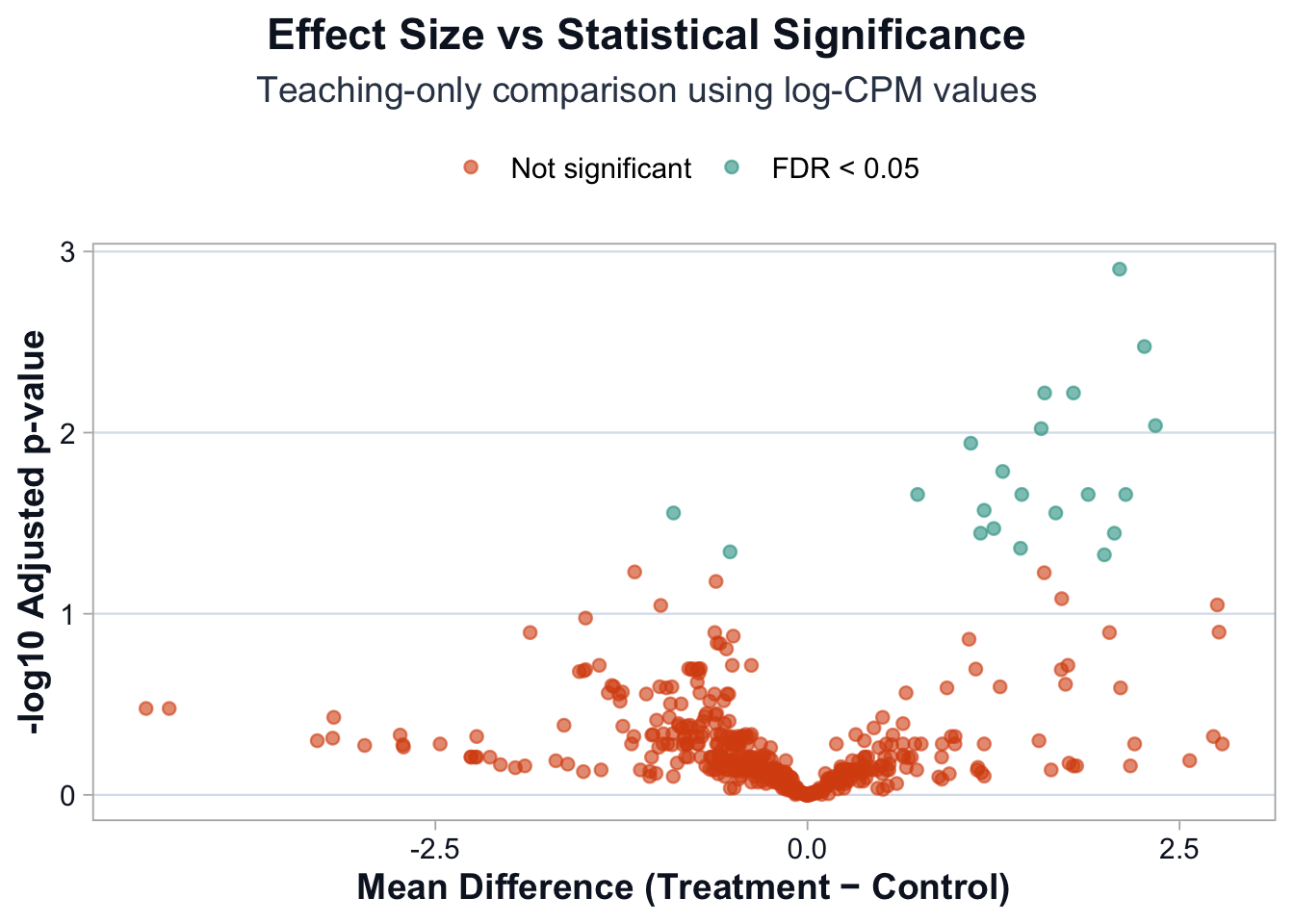 To illustrate interpretation logic, we perform a simple gene-wise comparison using log-CPM values.
