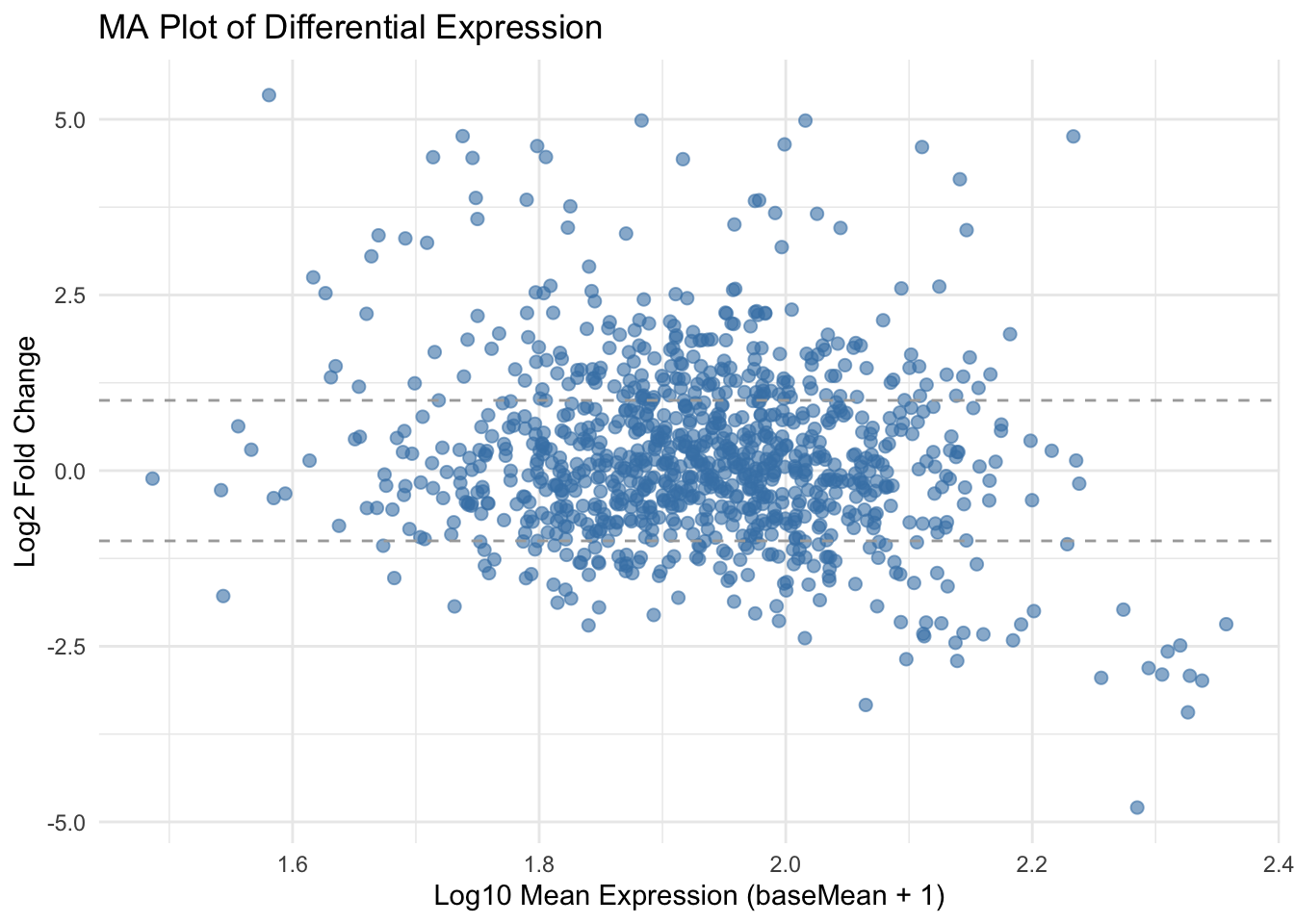 ✅ Takeaway: MA plots offer a quick summary of how expression changes relate to average gene abundance, helping detect outliers and trends in your DE analysis.